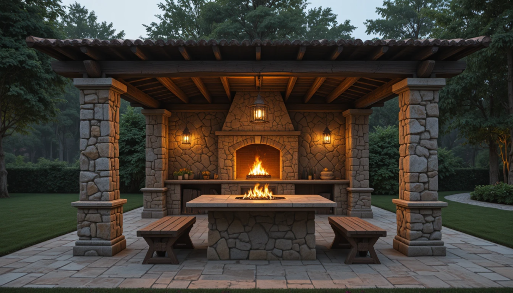 3. Pérgola rústica con parrilla de piedra natural, mesa de madera, entorno verde, iluminación de atardecer, ambiente campestre.