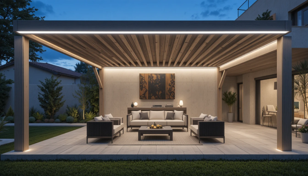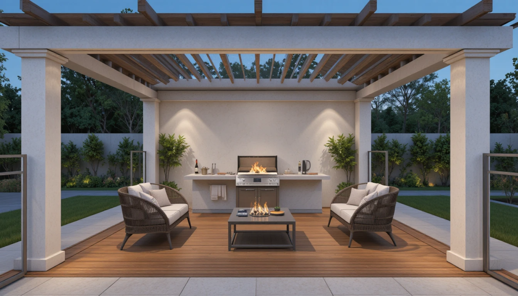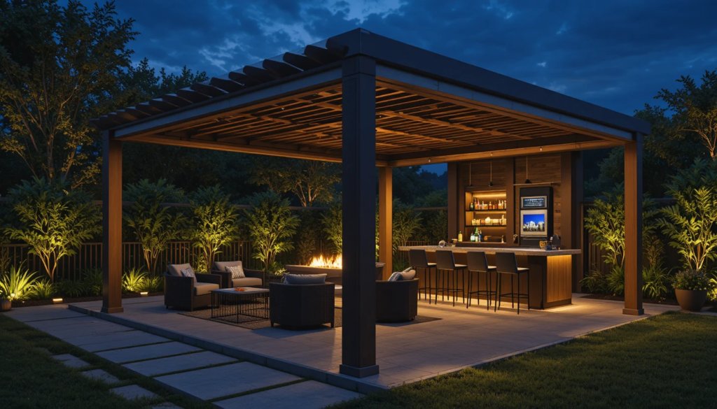 5. Pérgola moderna para terraza con parrilla, barra de bar, sillas altas, iluminación nocturna, ambiente social.