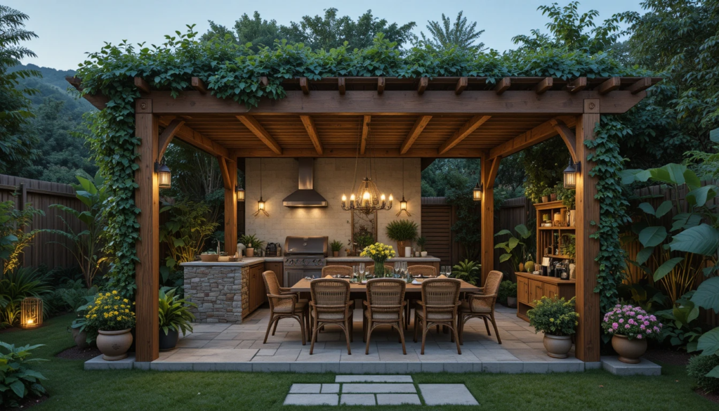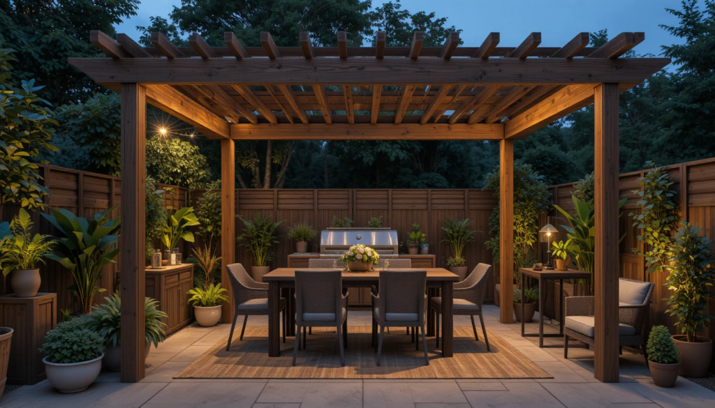 - Pérgola de madera para terraza con parrilla de ladrillo, mesa familiar, iluminación cálida, plantas decorativas, ambiente acogedor, estilo rústico moderno.