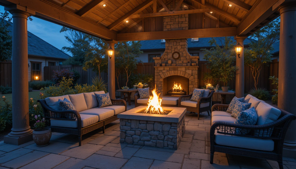 8. Pérgola con parrilla y fogata, sillones cómodos, ambiente nocturno acogedor, luces cálidas.