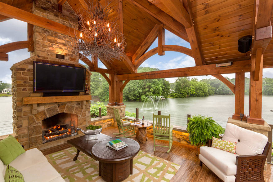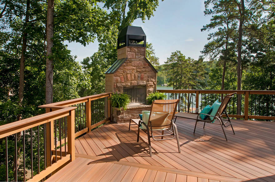 Patio encima de un lago, de madera y ladrillo en color marrón.