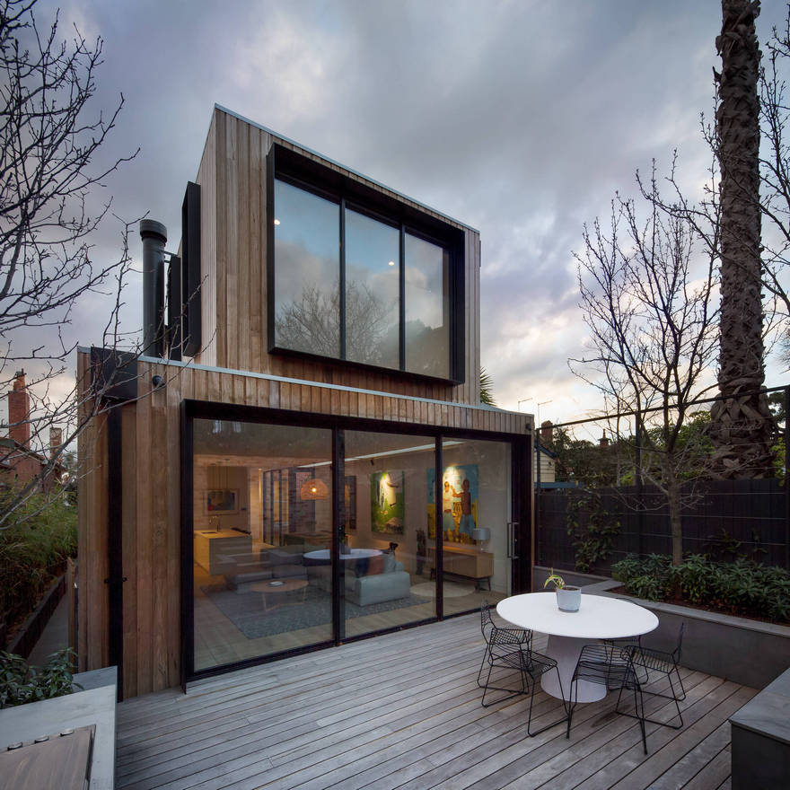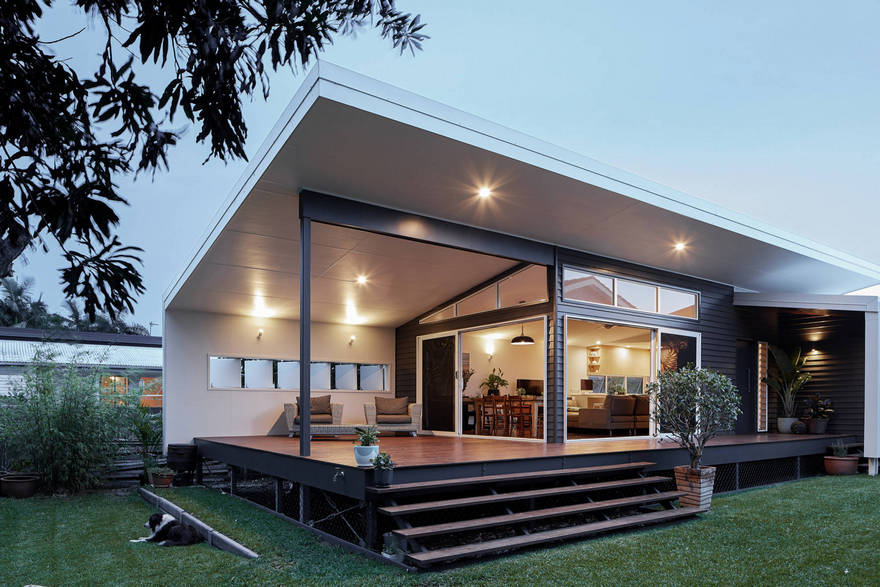 Patio con áreas verdes y casa de madera en color negro con amarillo.