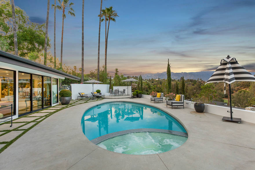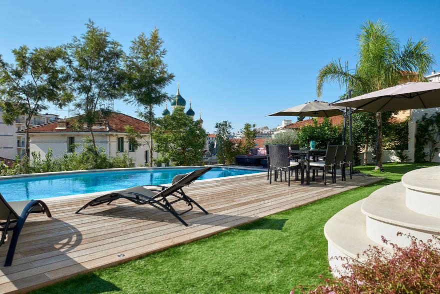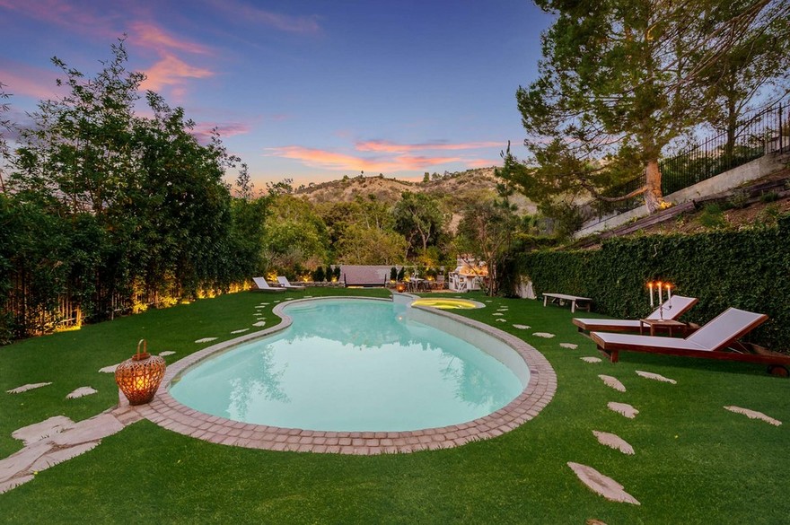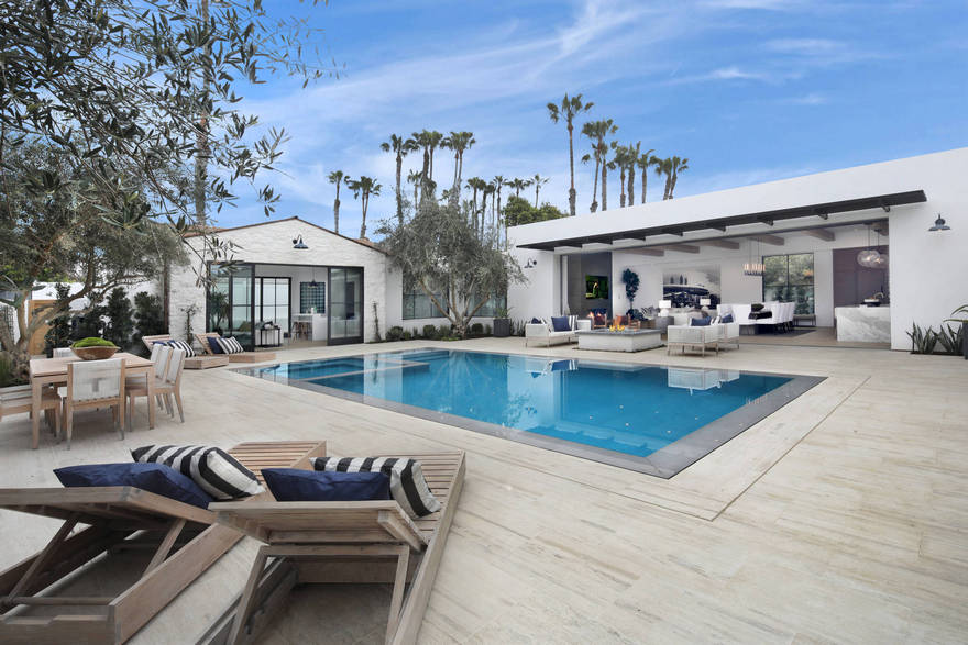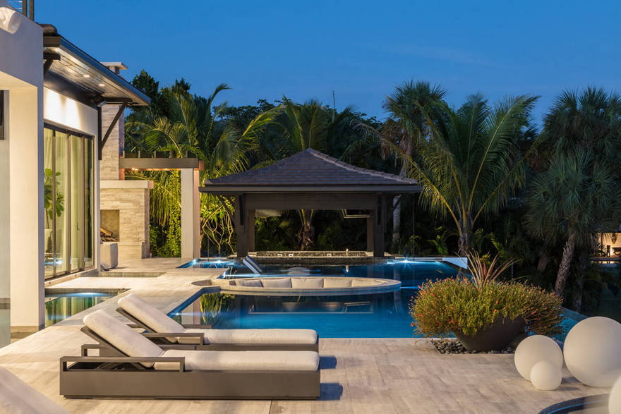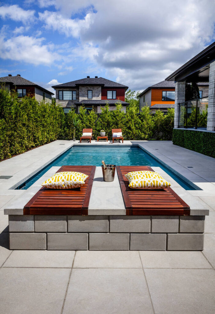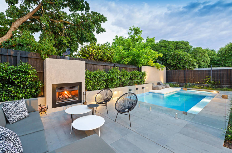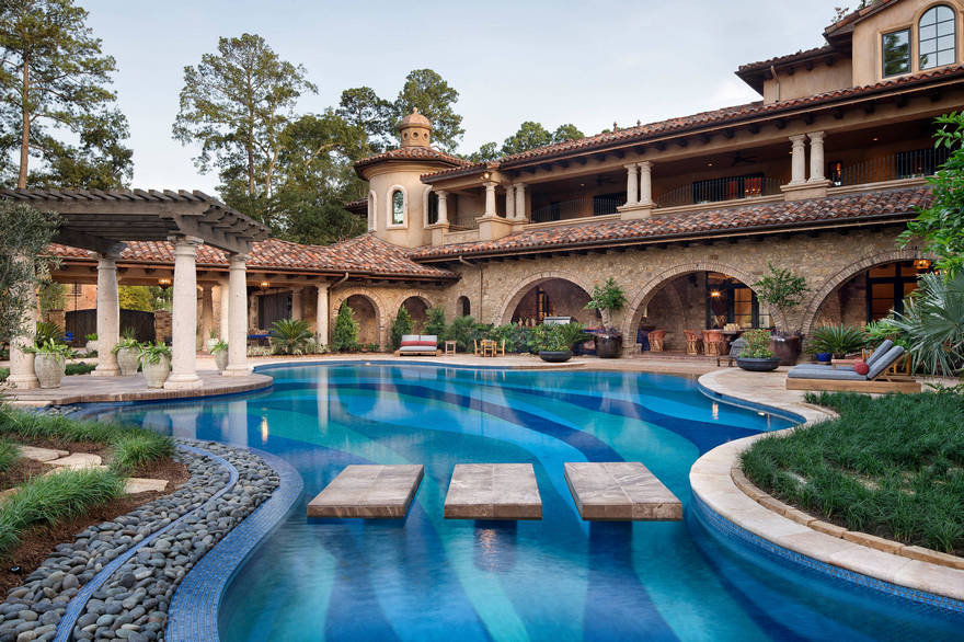 Patio de piedras de diferentes tamaños con piscina extensa.