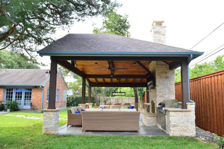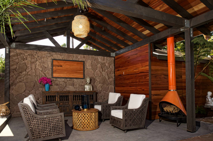 Patio de madera y piedra en colores neutros con muebles de color marrón.